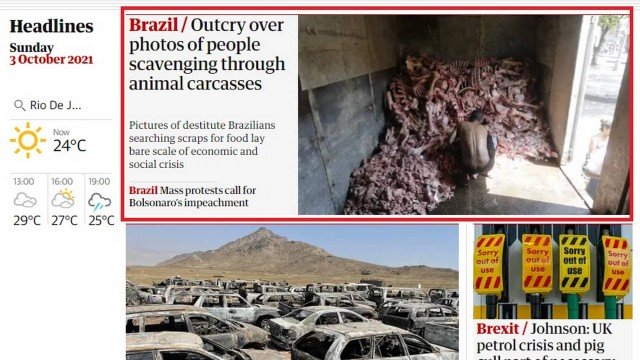 Após a reportagem do EXTRA sobre o garimpo de restos de ossos e carnes rejeitados por supermercados por moradores do Rio ganhar a atenção de internautas, artistas e políticos brasileiros, a capa da última quarta-feira, dia 29 de setembro, teve repercussão internacional. O jornal britânico The Guardian estampou em seu site uma matéria que relaciona a crise da fome aos protestos ocorridos nesse sábado (02), em todo o país, contra o presidente Jair Bolsonaro.