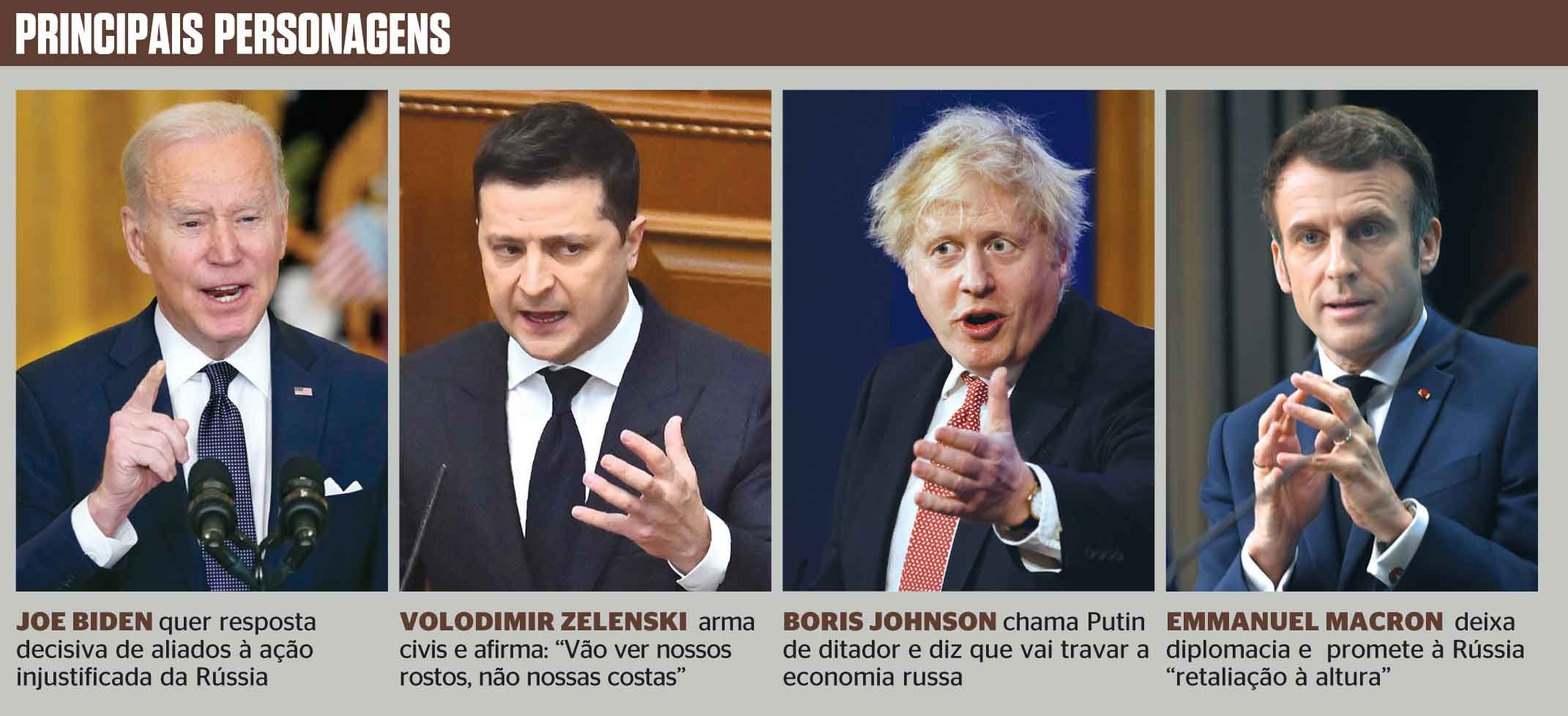Governantes europeus, como Emmanuel Macron, da França, Boris Johnson, do Reino Unido, e Olaf Scholz, da Alemanha, esse especialmente por causa da dependência estratégica do gás russo, estiveram em polvorosa durante a semana, operando a diplomacia a todo vapor, tentando evitar o pior. Agora prometem uma reação implacável. Sanções econômicas vinham sendo aplicadas pelos Estados Unidos e por países europeus e asiáticos contra Putin, na tentativa de dissuadi-lo a entrar numa guerra total. Depois da invasão, Boris Johnson disse que o governo britânico não ficará parado. “Junto com aliados europeus iremos aplicar medidas para sufocar a economia russa”, afirmou. “Essa ação odiosa vai terminar em fracasso e estamos lado a lado com os ucranianos.” O primeiro-ministro alemão Olaf Scholz considerou a operação militar na Ucrânia uma “flagrante violação do direito internacional”. “A Alemanha condena nos termos mais enérgicos esse ato inescrupuloso do presidente Putin. Nossa solidariedade está com a Ucrânia e seu povo.”