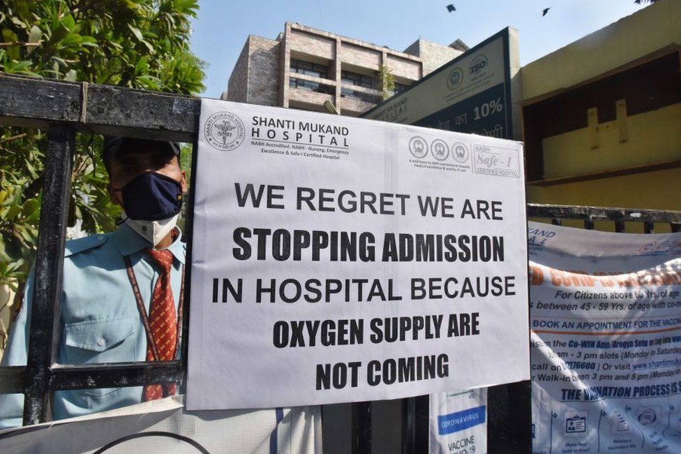 In the northern state of Uttar Pradesh, some hospitals have put "oxygen out of stock" boards outside, and in the state capital Lucknow hospitals have asked patients to move elsewhere.