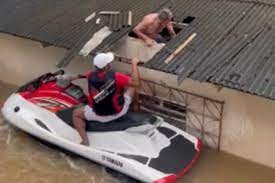 O telhado da residência precisou ser quebrado para acontecer o resgate. Um homem pilotando um jet ski ajudou o idoso, ainda não identificado, que pediu socorro pela janela da casa — que estava quase subermesa pelas águas do Rio Acre. As imagens foram compartilhadas nas redes sociais.