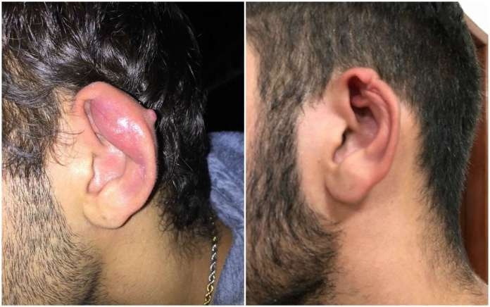 “Infeccionou, peguei uma bactéria hospitalar e acabou deformando minha orelha. Dois dias depois que eu coloquei o piercing, começou a inflamar e antibiótico nenhum deu jeito. Como a orelha estava muito inflamada, o médico precisou abrir para fazer uma limpeza. Foi uma dor horrível que eu senti”, lembra o jovem.