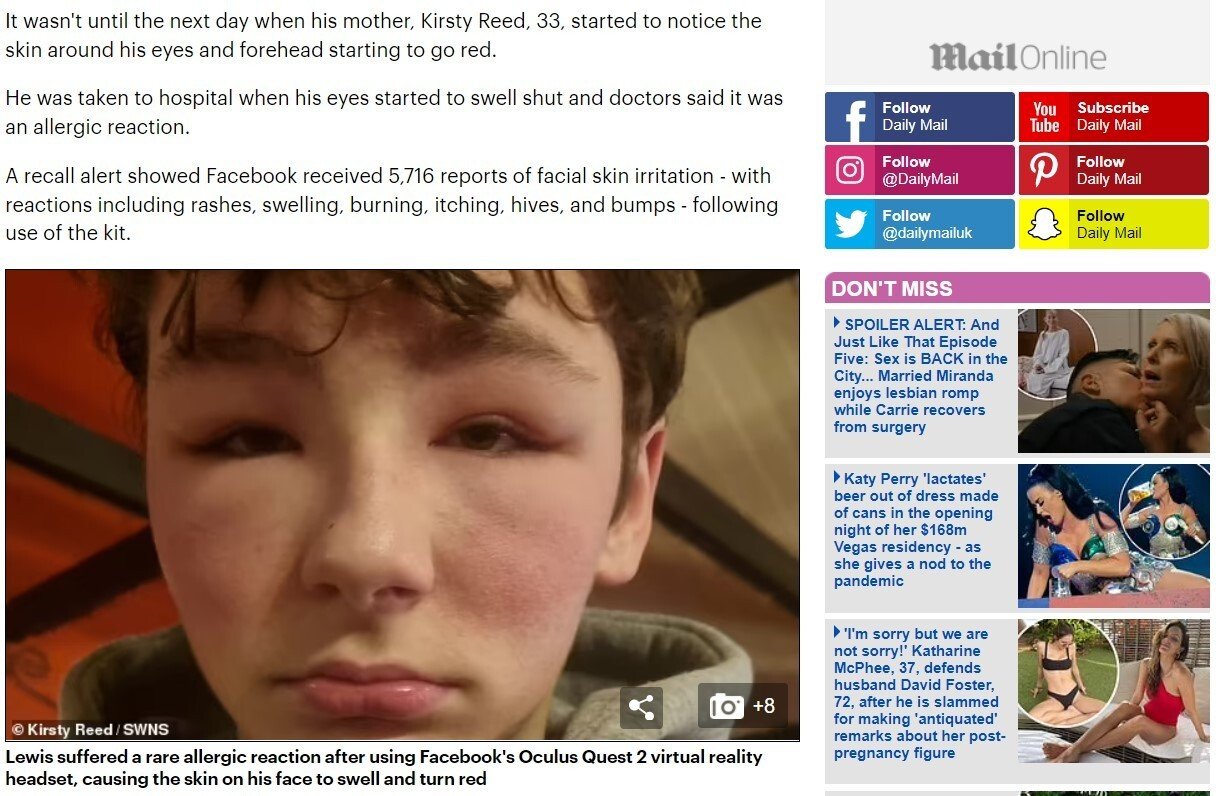O adolescente Lewis Gray, de 13 anos, precisou ser levado para a emergência de um hospital em Surrey, na Inglaterra, após ter uma “reação alérgica” ao Oculus Quest 2 (óculos de realidade virtual da Facebook Technologies). O menino passou o dia brincando com o equipamento, que foi um presente de Natal da avó dele. As informações são do jornal Daily Mail.