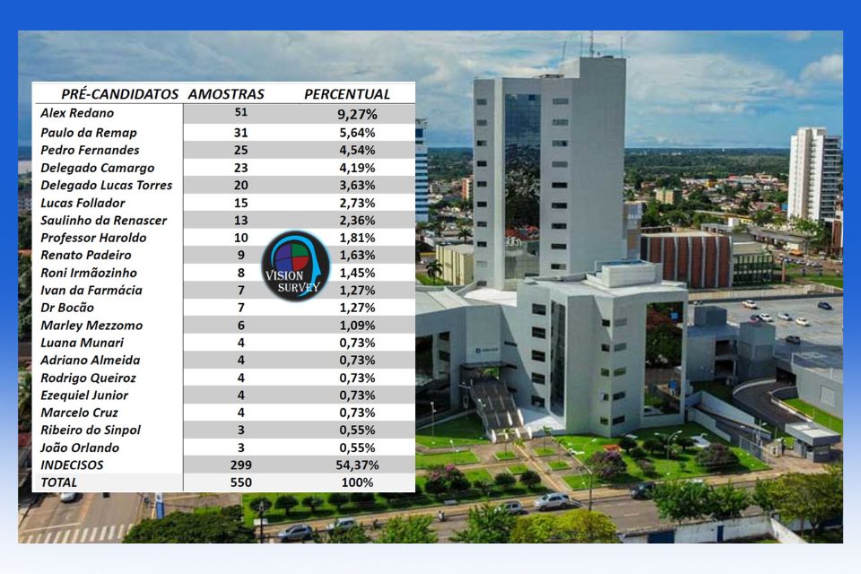 Segundo a pesquisa, se a eleição fosse hoje, a primeira colocação das intenções de voto seria do deputado estadual e Presidente da Assembleia Legislativa, Alex Redano (Republicanos), com 9,27%.