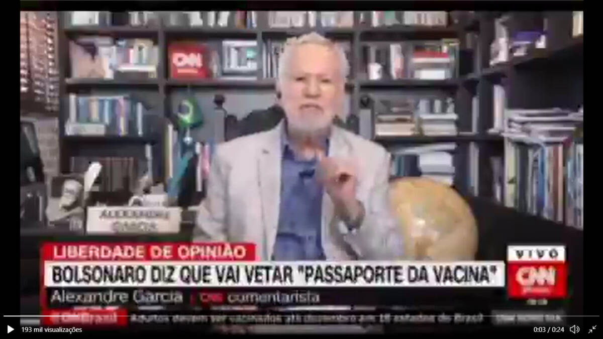 Alexandre Garcia afirmou: “A locomoção interna fica uma coisa esquisita. Eu fico lembrando dos tempos de Hitler e da Davi. Pra separar tem cidadãos de uma categoria e outros de outras: os vacinados e os não vacinados. Isso cheira muito a totalitarismo de 1984 de George Orwell”.