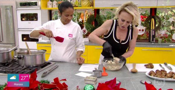 Durante a receita, a apresentadora conversa apenas com um boneco em forma de papagaio, fala o quanto a receita é deliciosa, prática e fácil de fazer.