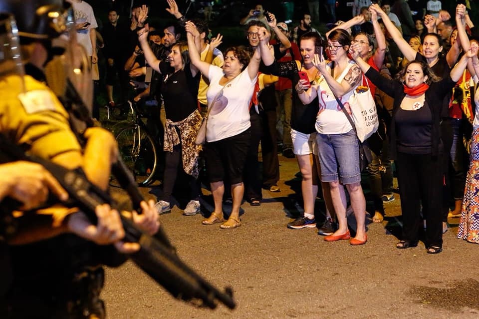 Em seguida, bombas de efeito moral foram lançadas contra o ato, que ocorria desde a manhã e reunia representantes de quatro denominações religiosas diferentes, artistas, famílias, professores e estudantes, alem de militantes dos movimentos sociais que integram as frentes Povo Sem Medo e Brasil Popular.