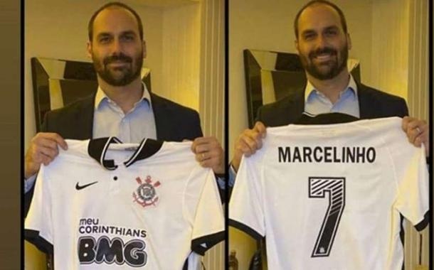 247 - O deputado Eduardo Bolsonaro (PSL) publicou uma foto com uma camisa do Corinthians e o nome de Marcelinho Carioca, em suas redes sociais, que foi compartilhada pelo ex-jogador compartilhou a imagem e agradeceu o deputado por exibir o presente.