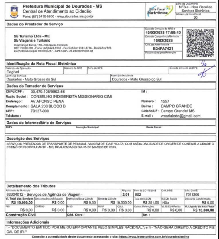 Nota fiscal obtida pela revista Veja contra Cimi / Metrópoles