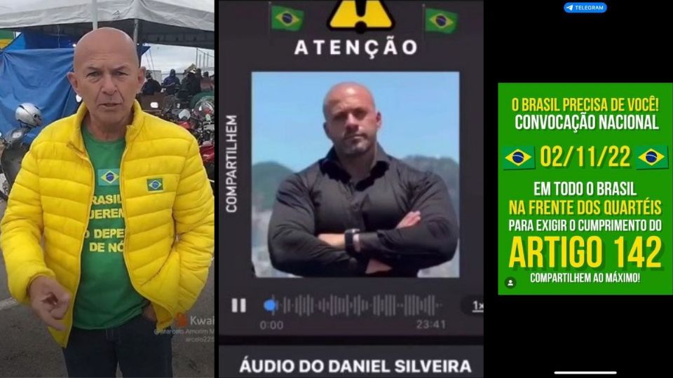 No grupo Exército de Bolsonaro, com 29 mil seguidores - já chegou a ter mais de 35 mil durante as eleições -, os radicais propagam áudios atribuídos a Eduardo Bolsonaro (PL-SP), que ainda não se pronunciou sobre a derrota do pai, Daniel Silveira (PTB-RJ) e até mesmo Walter Braga Netto, candidato a vice na chapa de Bolsonaro. Além disso, há vídeo de um sósia de Luciano Hang, o véio da Havan, direto do protesto em Palhoça, no litoral de Santa Catarina.