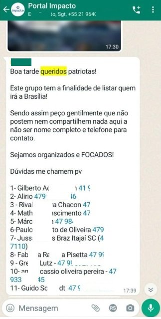 Em alguns dos grupos, organizadores das caravanas pediam nome completo e número de celular dos bolsonaristas interessados em viajar para as invasões.