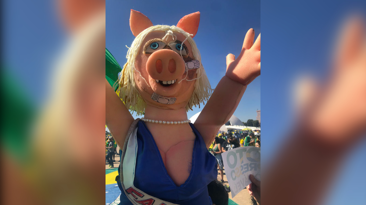 A imagem é de um boneco da Peppa Pig, apelido dado a ex-aliada pelos filhos de Jair Bolsonaro (Sem partido), Carlos e Eduardo Bolsonaro, após ela romper com o clã.