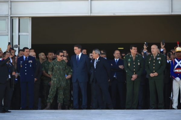 Um grupo de apoiadores do presidente se reuniu na praça dos Três Poderes, em frente à rampa presidencial, durante o desfile. O grupo proferiu palavras de ordem como “Mito”, “Eu autorizo” e “142”, esse último em referência ao artigo 142 da Constituição, que trata sobre as Forças Armadas.