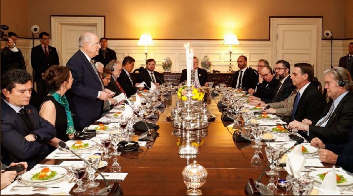 Em viagem aos Estados Unidos, o presidente Jair Bolsonaro postou no Twitter uma foto ao lado do filósofo autodidata Olavo de Carvalho em um jantar oferecido neste domingo (17/3) pelo embaixador do Brasil em Washington, Sérgio Amaral. No mapa de assentos, Olavo de Carvalho e o ex-estrategista e ex-aliado de Trump, Steve Bannon, ocupam os assentos ao lado do presidente.