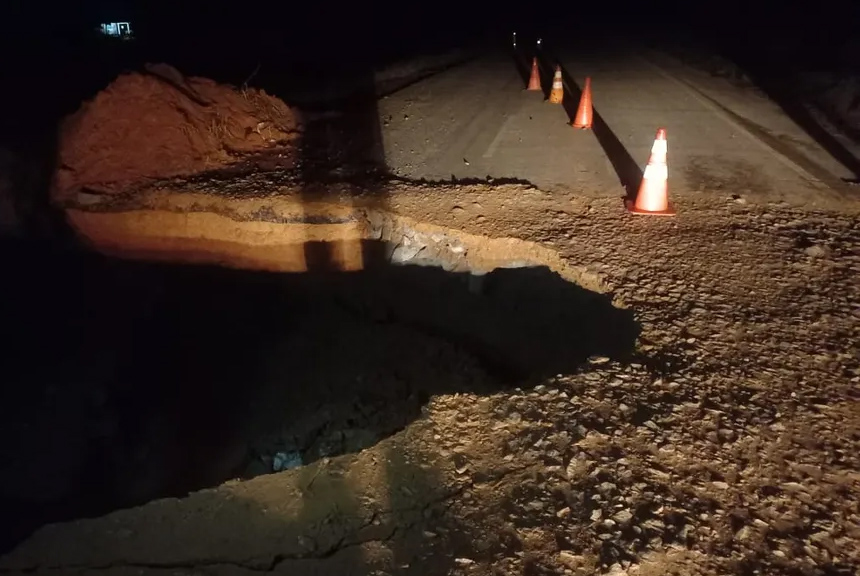 Houve o surgimento de um enorme buraco no meio da pista. As equipes do DNIT seguem monitorando o trecho e avaliam a melhor solução.