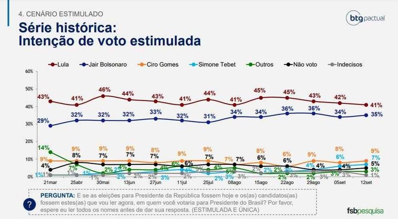 Segundo nova pesquisa da BTG Pactual, divulgada nesta segunda-feira (12/9), o petista tem 41% das intenções de voto; Bolsonaro, 35%. Esta é a menor diferença registrada entre os candidatos desde a série histórica iniciada no fim de março.