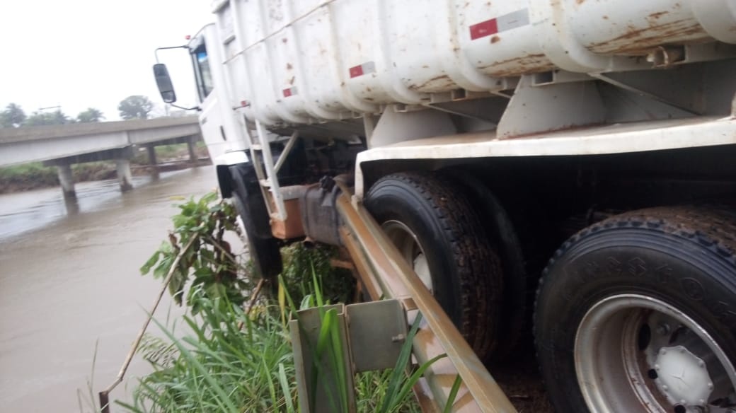 O caminhão só não caiu dentro do rio, devido ao Gaurd Rayl ser resistente e segurar o veículo.