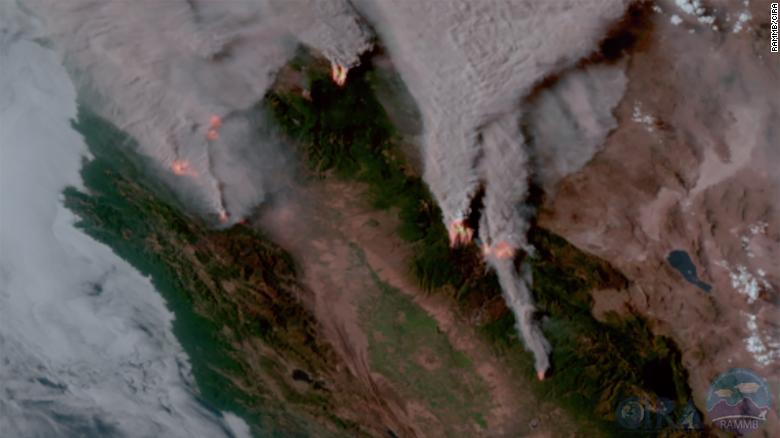 Several large wildfires and the smoke they're producing in Northern California were captured Wednesday using a sensor aboard NOAA's GOES-West satellite to depict the fire temperature (red color) and natural color of the surrounding area.