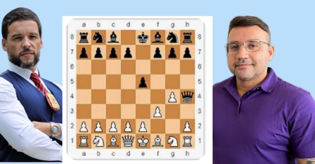 Brancas avançam peão do cavalo do rei. Movimento sinistro, que deixou o rei desprotegido. Pretas movimentam a dama e dão um xeque indefensável. É mate