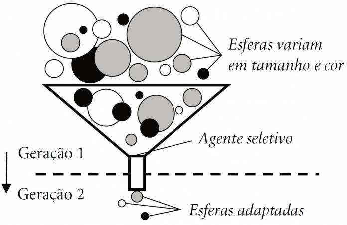[FIGURA. A imagem que acompanha este artigo ilustra a seleção natural, processo que se manifesta quando algum fator ambiental impõe uma associação entre aptidão efenótipo. (1) As esferas variam em cor e tamanho (traços fenotípicos); (2) a largura da saída do funil (agente seletivo) cria um diferencial na aptidão – as chances de sobrevivência e reprodução passam a depender do fenótipo; e (3) esferas pequenas são ditas adaptadas, pois atravessam o funil. (Note que a coloração, neste caso, não afetaa aptidão.)]