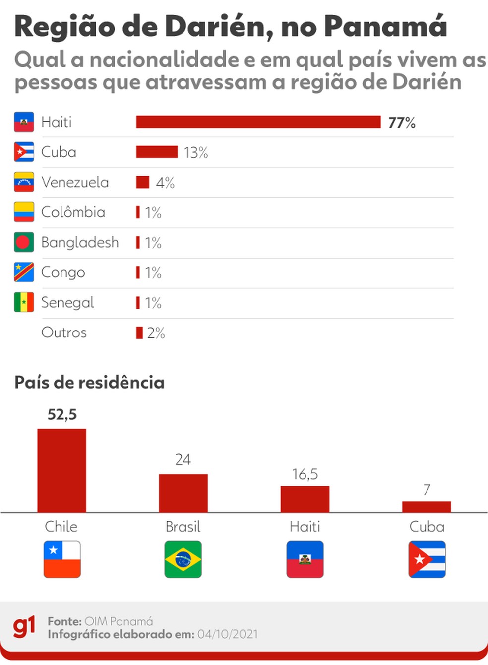 Dessas, cerca de 24% tinham residência no Brasil, mas apenas 0,46% eram brasileiras —de acordo com um representante da OIM no Panamá ouvido pelo g1, esse não é um caminho que brasileiros fazem para tentar chegar aos EUA; a grande maioria das pessoas que tinham residência no Brasil é de haitianos.