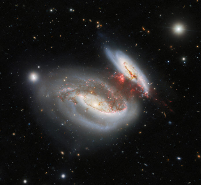 As colisões de galáxias são eventos transformadores, em grande parte responsáveis por conduzir a evolução do universo. A mistura e a combinação de material estelar é um processo incrivelmente dinâmico que pode levar à formação de nuvens moleculares preenchidas com estrelas recém-formadas. Mas uma colisão frontal entre as chamadas galáxias “Taffy”, a UGC 12914 (à esquerda na foto) e a UGC 12915 (à direita), ocorrida entre 25 e 30 milhões de anos atrás, parece ter resultado em um tipo diferente de estrutura – uma ponte de material altamente turbulento que abrange as duas galáxias. Embora essa ponte intergaláctica esteja repleta de material de formação de estrelas, sua natureza turbulenta está suprimindo essa formação.