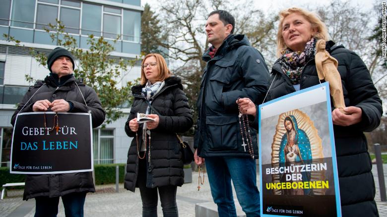 Anti-abortion activists pray during a "40 Days For Life" picket outside the Pro Familia center in Frankfurt, Germany, on March 26, 2019. The state-approved center offers consultations on abortions.