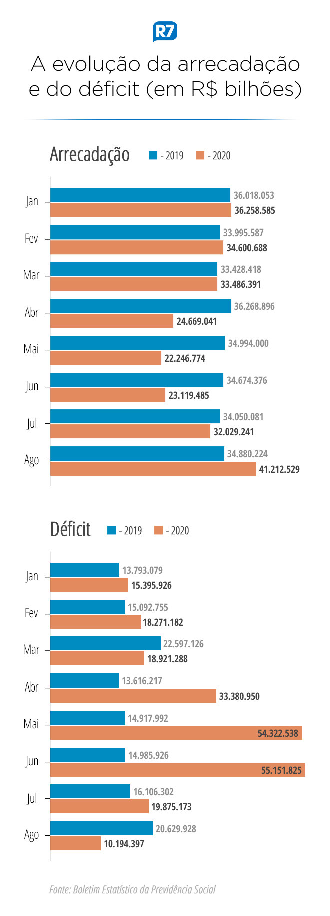 A redução na arrecadação e o aumento da despesa com a antecipação do 13º salário do INSS são os principais motivos para o aumento do rombo. A medida foi determinada pelo governo federal para diminuir os efeitos da covid-19 na população de baixa renda. Também foi antecipado o pagamento do BPC (Benefício de Prestação Continuada) e auxílio-doença.
