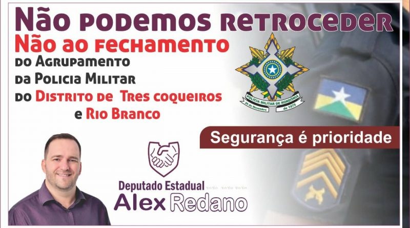 O deputado estadual Alex Redano(PRB), diz NÃO, ao fechamento do Agrupamento da Polícia Militar no Distrito de Três Coqueiros e Rio Branco. Segundo o parlamentar, ele foi um dos que lutaram arduamente, para a implantação do agrupamento nos distritos, e não concorda em retroceder.