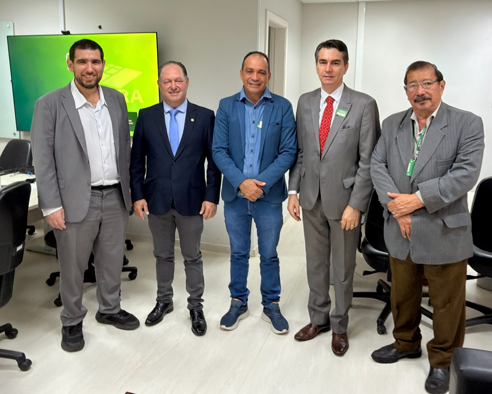 O deputado estadual Pedro Fernandes (PRD) participou nesta quinta-feira (5), de reunião em Brasília (DF) com o diretor de Gestão Estratégica do Instituto Nacional de Colonização e Reforma Agrária (INCRA), Gustavo Souto de Noronha, para tratar do fortalecimento da regularização fundiária em Buritis e nos municípios do Vale do Jamari. A agenda foi articulada juntamente com o presidente da Câmara Municipal de Buritis, vereador Adriano Almeida, e o assessor Sigmar Nunes, representando o deputado federal Lúcio Mosquini, que acompanharam o deputado na busca por soluções e avanços para as demandas fundiárias do município.