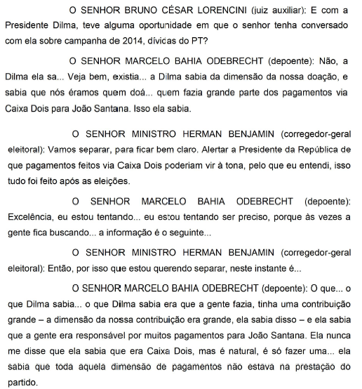 O executivo Marcelo Odebrecht simplesmente sepultou a ex-presidente Dilma Rousseff em seu depoimento ao ministro do Tribunal Superior Eleitoral, Herman Benjamim. O site O Antagonista teve acesso à integra do depoimento do ex-presidente da empreiteira, que confirmou que Dilma estava a par de todo o esquema de financiamento ilícito de sua campanha.