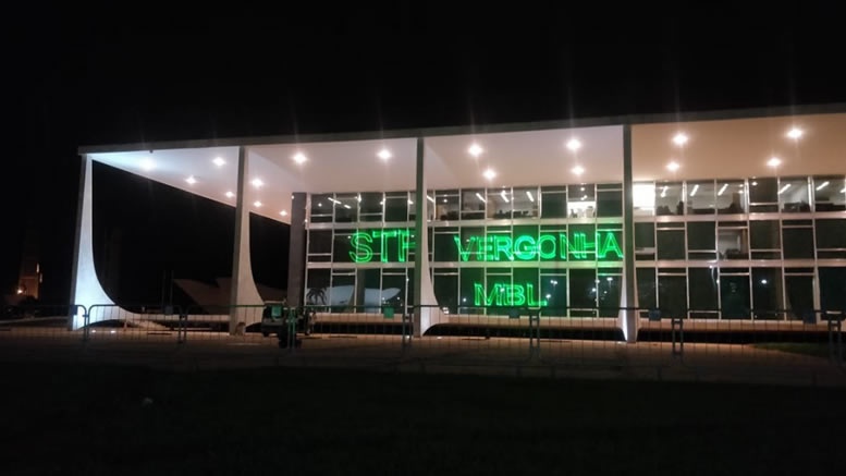 O Movimento Brasil Livre (MBL) projetou (ontem à noite) no prédio do Supremo Tribunal Federal (STF) os dizeres “Vergonha STF” em resposta ao ministro Ricardo Lewandowski, que mandou prender o advogado Cristiano Caiado Acioli, após ele dizer que sentia vergonha do STF.