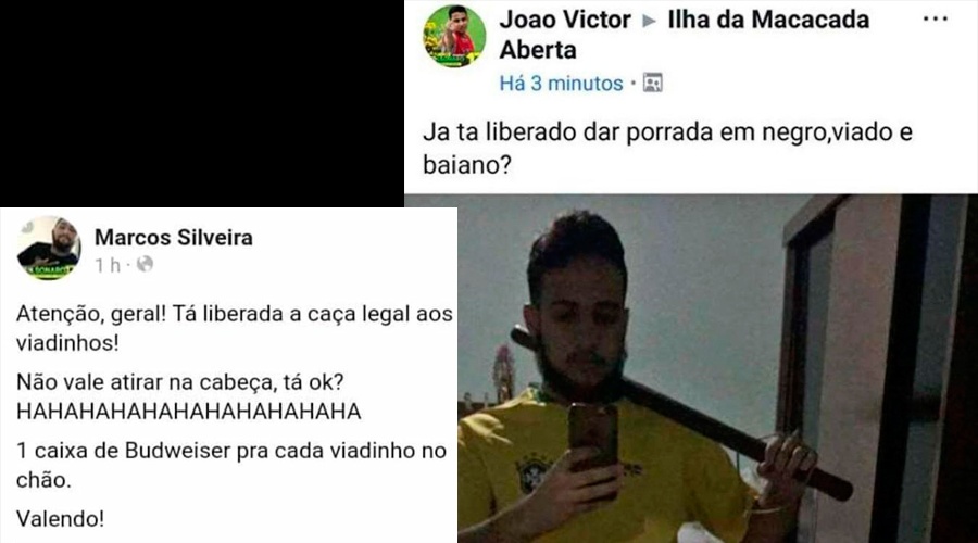 Uma das publicações foi feito por um jovem que usava uma camiseta da seleção brasileira de futebol e empunhava um cassetete. Na legenda, ele escreveu: “Já está liberado dar porrada em negro, viado e baiano?” A postagem foi compartilhada nas redes sociais e chegou à Fórum com pedido de de denúncia de crime.