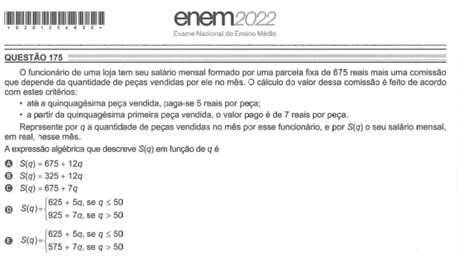 O candidato deveria assinalar qual seria a expressão algébrica que descreve o salário mensal do funcionário em função da quantidade de peças. Porém, “a questão 175 [da versão amarela] não tem alternativa correta”, diz Giuseppe Nobilioni, coordenador de matemática do Objetivo.
