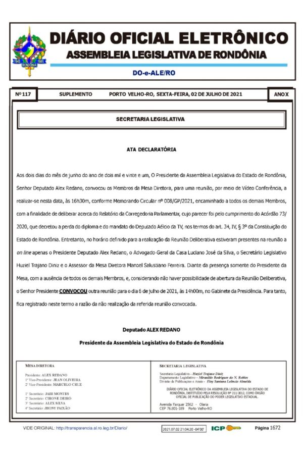 Nesse jogo de cena, para fingir que estão trabalhando para cumprir a determinação judicial, o expressaorondonia teve acesso a uma ata declaratória de tentativa de reunião da Mesa Diretora presidida por Alex Redano, mas que além dele próprio, nenhum outro deputado compareceu. Tem todo jeito de jogo combinado, para tentar enganar a Justiça.