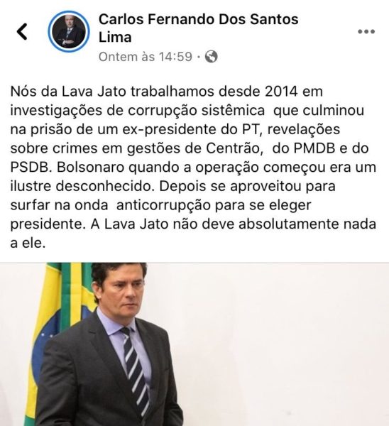O ex-procurador de Curitiba, Carlos Fernando dos Santos Lima, defende nas redes sociais a decisão de Sergio Moro de deixar o Ministério da Justiça alegando que Jair Bolsonaro quer interferir nos trabalhos da Polícia Federal em causa própria. Contrariando análises de cientistas políticos, Lima escreveu no dia 25 de abril que a Lava Jato não elegeu Bolsonaro, mas que o líder de extrema-direita surfou na onda anticorrupção e se aproveitou disso.