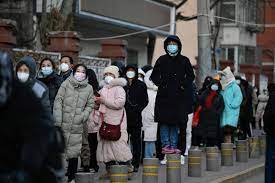 Embora alguns centros de testes tenham sido desativados, longas filas se formaram diante das áreas de teste ainda em operação, o que obriga os moradores a aguardar no frio do inverno pelos exames de covid que continuam obrigatórios em grande parte da China.