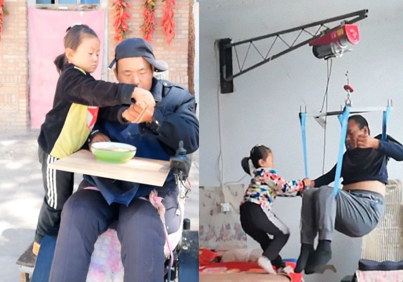 Jia Jia se levanta todos os dias às 6 da manhã e massageia os músculos do pai por meia hora. Antes de ir para a escola, a garotinha também escova os dentes do pai e lava o rosto dele.