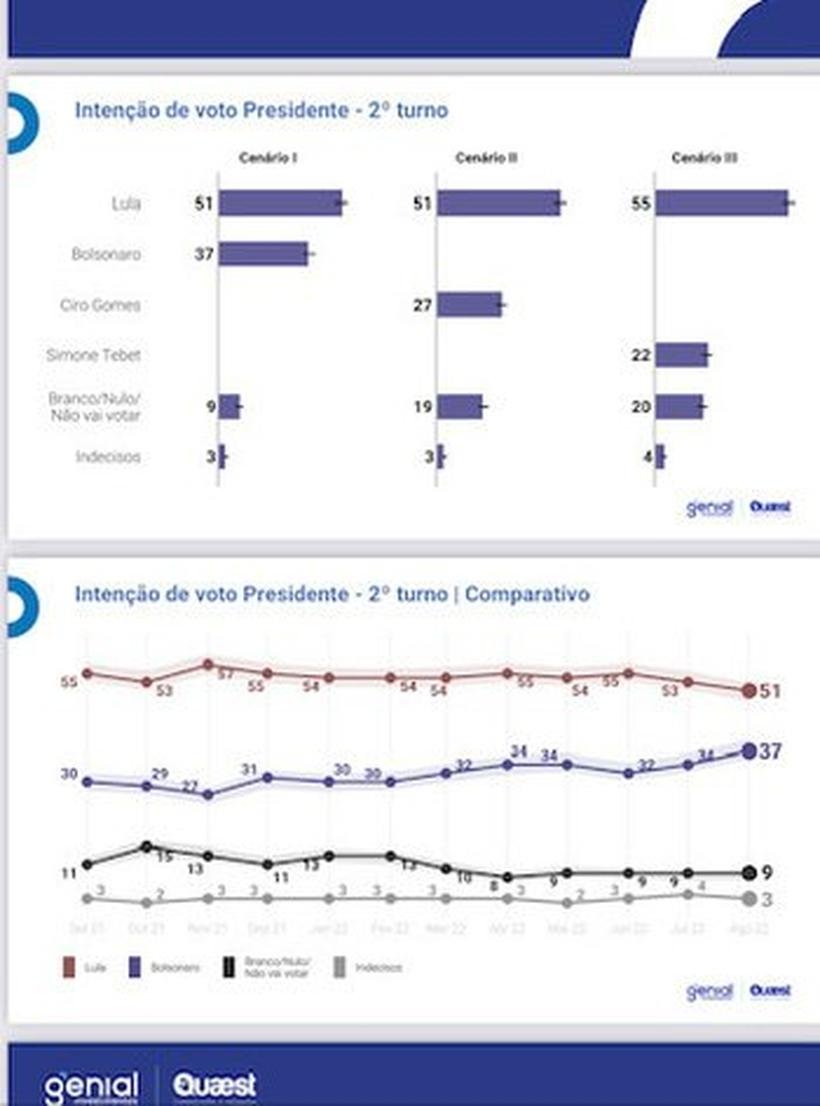 Em um eventual segundo turno, Lula continua à frente em todos os cenários, Tem com 51% dos votos contra Bolsonaro, que ficou com 37%. Na enquete de junho, o placar era de 53% a 34%. Em um embate contra Ciro, Lula vence com 51% a 27%. E, contra Simone Tebet, a vantagem é maior, de 55% a 22%.