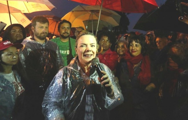 A senadora presidente do PT e líder no acampamento dos desocupados que ocupam o entorno da sede da Policia Federal onde Lula encontra-se preso para o cumprimento da pena de doze anos e um mês.