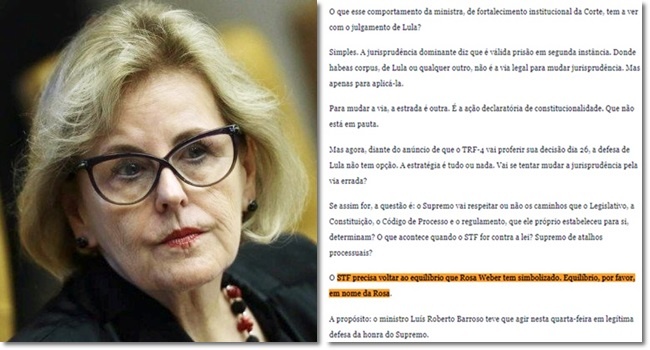 O jornal O Globo publicou artigo nesta quinta-feira (22), assinado por Joaquim Falcão, onde insinua que o “equilíbrio”, o “rumo da democracia”, seria a negação do habeas corpus a Lula e, consequentemente, a sua prisão imediata. E, mais ainda, quem tem demonstrado esse “equilíbrio” seria a ministra Rosa Weber.