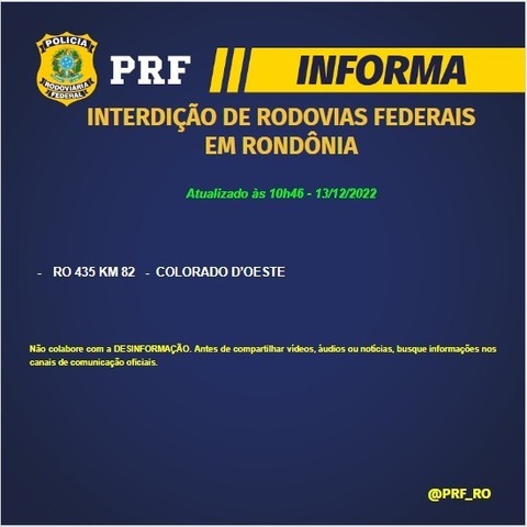 Boletim divulgado às 10h46 desta terça-feira (13) pela Polícia Rodoviária Federal (PRF) informa a existência de apenas um bloqueio de rodovia, na estadual RO-435, km 82, em Colorado do Oeste.