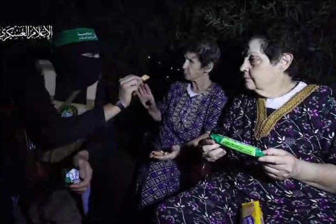 Horas depois de veículos de comunicação anunciarem a disposição do Hamas em libertar novos reféns, o grupo extremista palestino soltou, nesta segunda-feira (23/10), as israelenses Nurit Cooper, 79 anos, e Yocheved Lifshitz, 85, capturadas durante os atentados de 7 de outubro. As duas idosas deixaram a Faixa de Gaza por meio da passagem de Rafah, na fronteira com o Egito, depois de uma negociação mediada pelas autoridades egípcias e pelo Catar. O próprio Hamas divulgou um vídeo do momento do resgate: Nurit e Yocheved aparecem ao lado de homens encapuzados, fortemente armados e ostentando uma bandana com as cores da bandeira do grupo. Elas são alimentadas, recebem água e, depois, passam à responsabilidade da Cruz Vermelha.