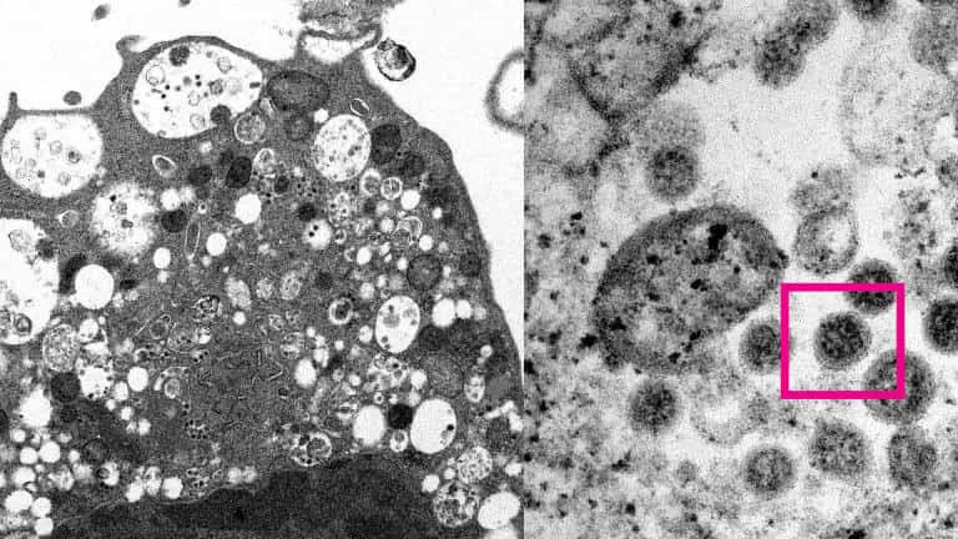 Já a parte direita da imagem, vê-se uma célula infectada. Na parte que tem uma caixa vermelha, observa-se partículas virais com pontas em forma de coroa.