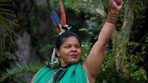Com um cocar colorido, esta nativa da floresta amazônica (nascida na Terra Indígena Arariboia, no Maranhão), que saiu de casa muito jovem para cursar a universidade, conduziu um comício acompanhado por uma multidão que gritava: “Fora, Bolsonaro!”.
