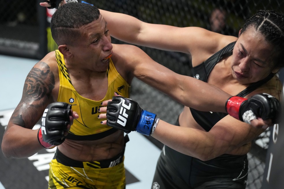 Josiane Nunes (esq.) machuca Ramona Pascual (dir.) com o cruzado de esquerda — Foto: Chris Unger/Zuffa LLC