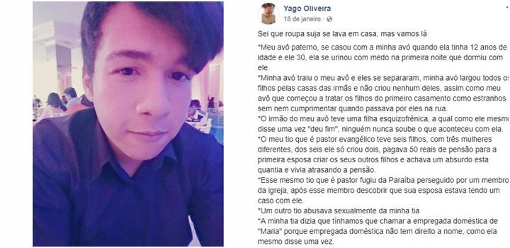 Rejeitado pela família depois de assumir a homossexualidade, Yago Oliveira descreve como era difícil conviver com a homofobia dos parentes. Até o fechamento deste texto, o desabafo de Yago no Facebook já acumula 140 mil curtidas e 43 mil compartilhamentos.