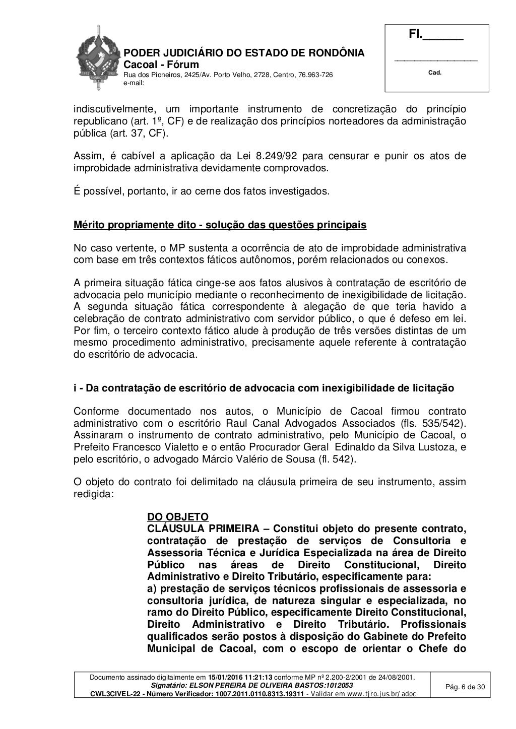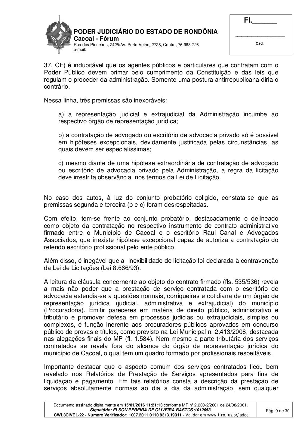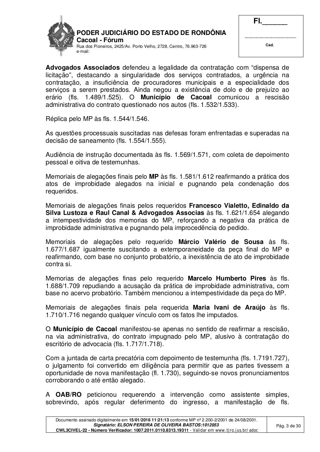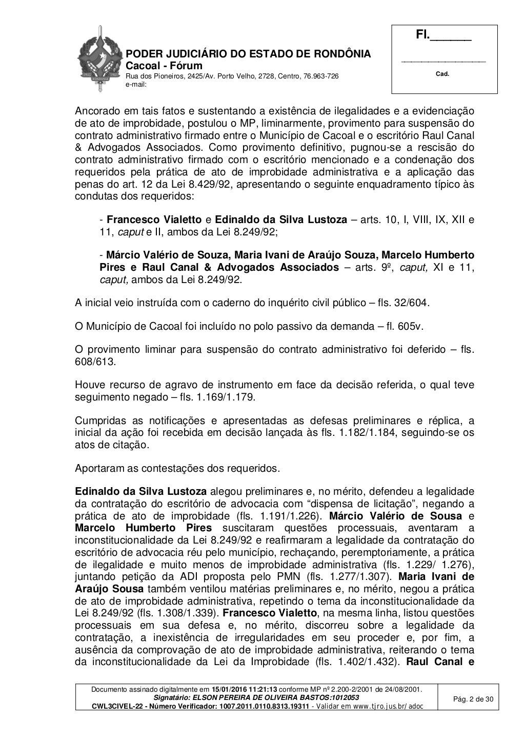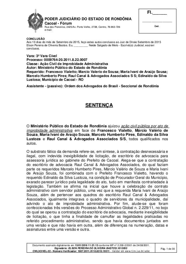 Porto Velho, RO — Em janeiro de 2016, o juiz de Direito Elson Pereira de Oliveira Bastos, da 3ª Vara Cível de Cacoal, condenou as seguintes pessoas pela suposta prática de improbidade administrativa: Francesco Vialetto, Edinaldo da Silva Lustoza, Maria Ivani de Araújo Sousa, Márcio Valério de Sousa e a empresa Raul Canal & Advogados Associados S/S.