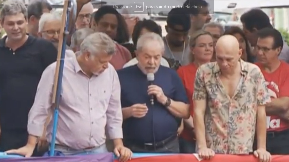 O ex-presidente Lula saiu do prédio do Sindicato dos Metalúrgicos do ABC, em São Bernardo do Campo, pela primeira vez desde a noite da última quinta-feira (5). O petista cumprimentou militantes e subiu em um palanque montado na frente do edifício, aos gritos de “Lula guerreiro do povo brasileiro”.