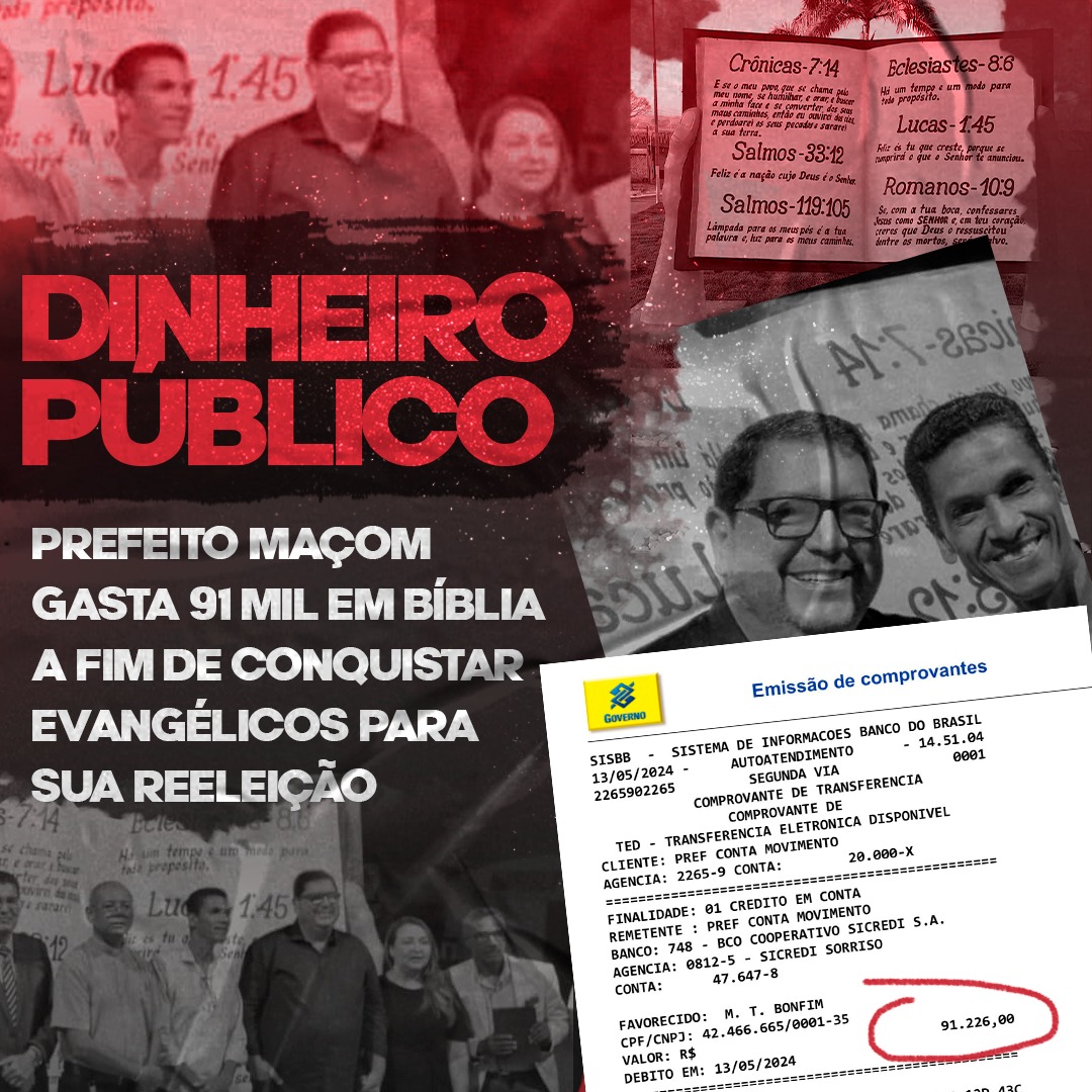 Se você estiver andando pelo centro da cidade e vir um carro caído dentro de um buraco no meio da rua, olhar para o outro lado e vir o prefeito maçom abraçado com o presidente da Igreja Assembleia de Deus, não se assuste. Você está em Machadinho D’Oeste, onde Paulo da Remap (PL) empregou o filho do pastor na prefeitura com salário de mais de R$ 7 mil e pagou mais de R$ 91 mil em uma bíblia de concreto, tudo para agradar evangélicos. Isso enquanto a cidade está abandonada. Politicagem?