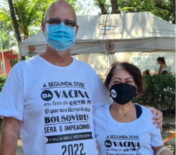 “A segunda dose da vacina nos livra da Covid-19. O que nos livrará dos ‘Bolsovírus’ será o impeachment ou o seu voto em 2022”, dizia a frase estampada nas camisetas de Luiz Carlos de Oliveira e Dirlene de Oliveira, ambos de 61 anos.